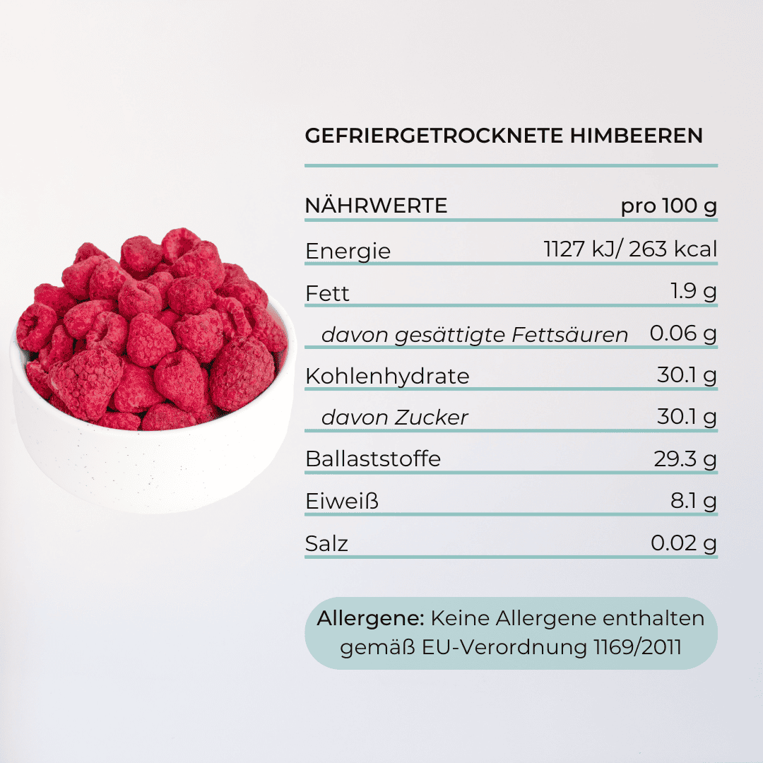 Unsere gefriergetrockneten ganzen Himbeeren können als Snack genossen werden oder als Zutat in vielen Gerichten wie Müslis, Smoothies, Joghurt oder Desserts verwendet werden. Sie eignen sich auch hervorragend als Topping für Eiscreme, Kuchen oder Torten. Die Möglichkeiten sind grenzenlos!