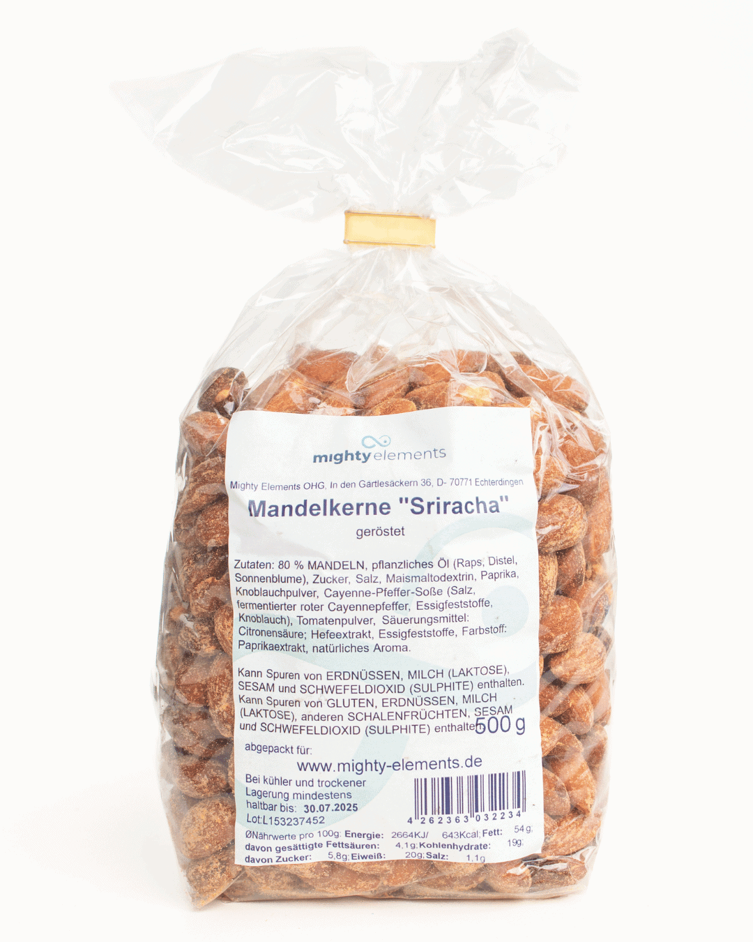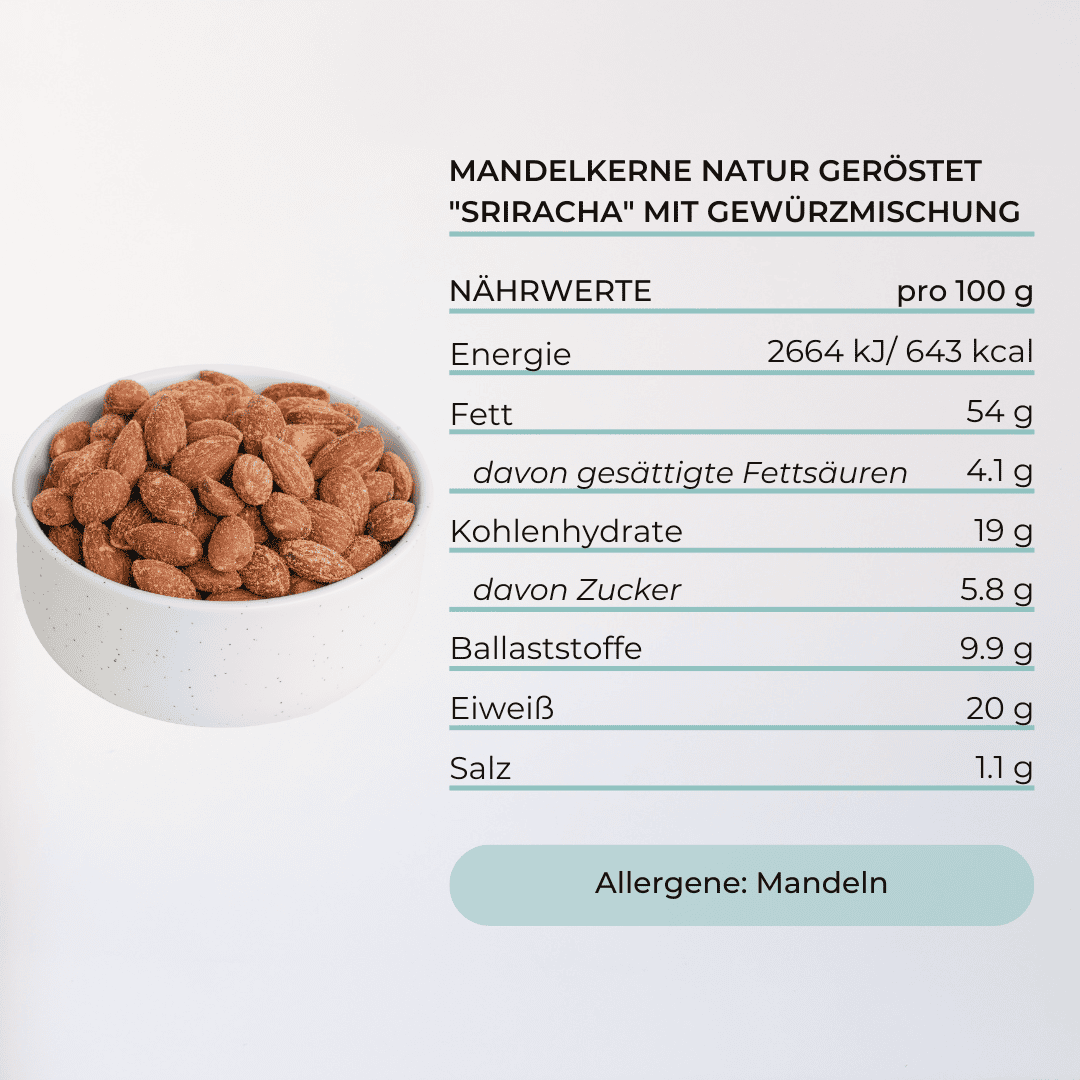 Mandelkerne, geröstet mit Sriracha-Würzmischung / almond kernels, roasted with sriracha-spice mix |